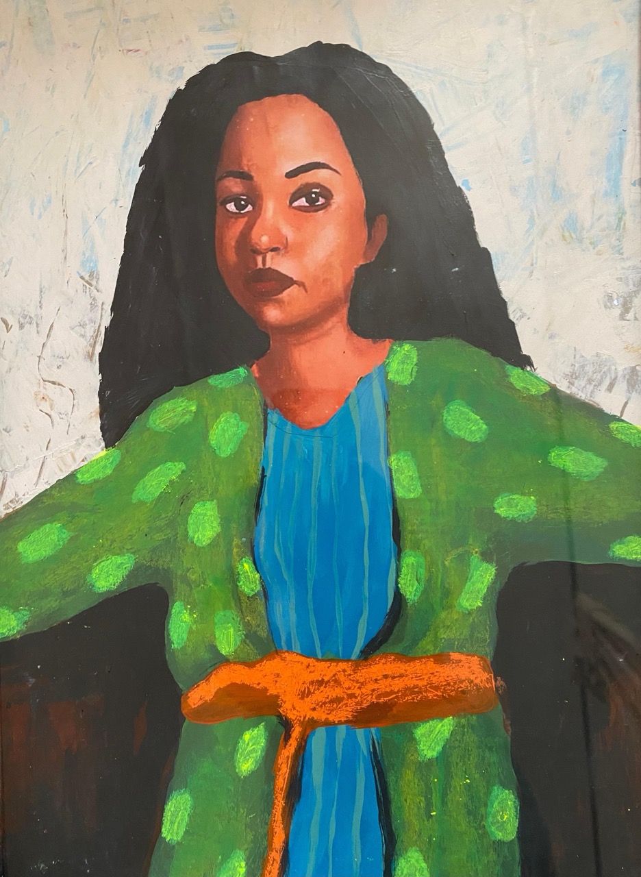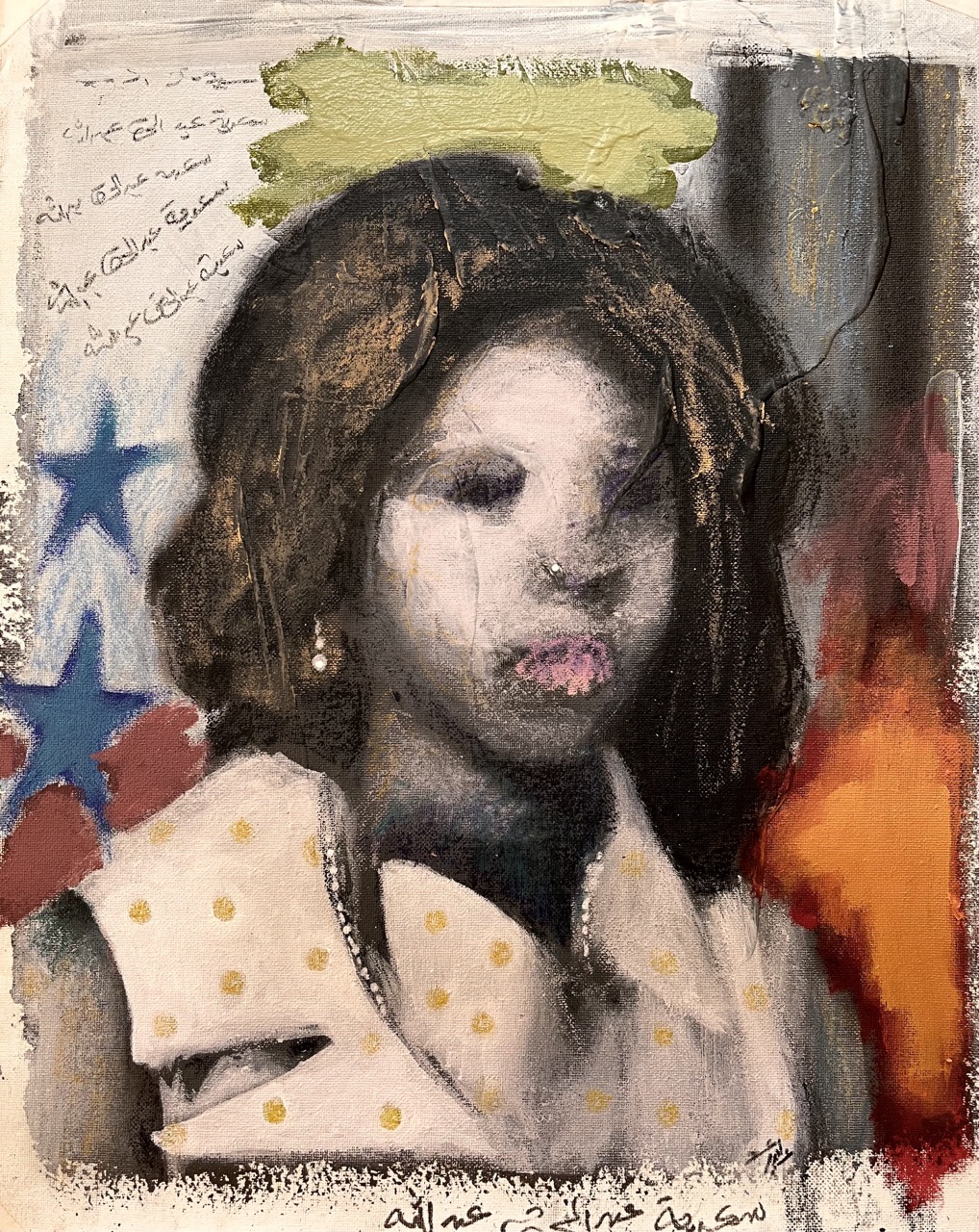 In the collection “Humanities”, Almogera Abdelbagi – known for his vibrant colors and bold brush strokes – muted not only his backgrounds with a specific coverage of white paint, but also the features of his figures into smudges of dark colors that seem to kill the livelihood of their existence in simulation to what waiting does to one’s spirit. Abdelbagi’s muting of backgrounds and obscuring of figures visualizes the erosion of stability and reflects how political and social upheaval profoundly alters the artist’s internal visual landscape. Amani Azhari’s paintings of vividly dressed women extend this inquiry, documenting repetitive, ritualized gestures that embody cyclical time. Her protagonists occupy thresholds, neither progressing nor regressing, yet their labor asserts agency within constraint. Her compositions focus on female spaces and the collective solidarity that is reassured within these intimate spaces.